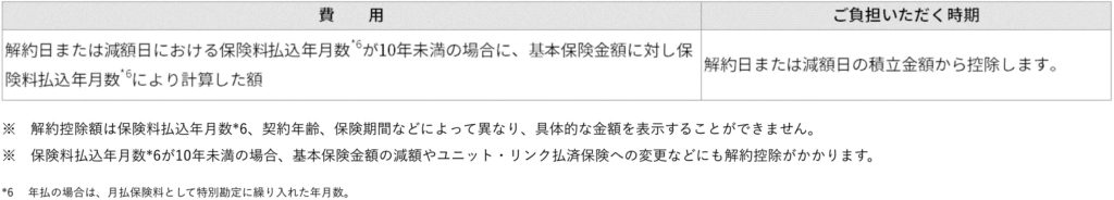 保険料払込時および保険期間中にかかる費用として、保険関係費と運用関係費。年金受取をする場合には年金管理費。10年未満の解約、減額、払済保険へ変更時に解約控除がかかります。