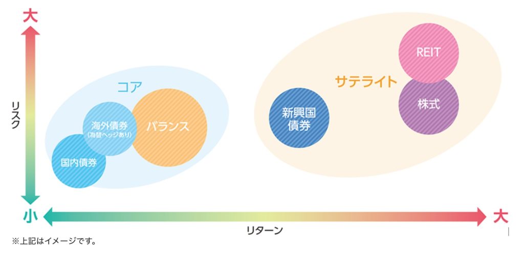 「サテライト」部分はリスクをとって大きなリターンが狙える資産クラスで運用していきます。
