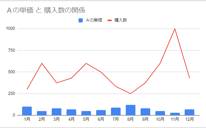 でもこれだけでは不十分でしょうから、もう少し詳しく見てみましょう。Aという商品、ここでは分かりやすく株式と考えてみます。このAという株式を1年間、毎月3万円ずつ購入するとしましょう。この株価が今月は100円だったとします。すると3万円で購入できる株数は300株となります。でも翌月株価が50円まで下がってしまいました。この場合、購入する株数は600株となります。単価と購入数の関係をグラフにすると下のようになります。