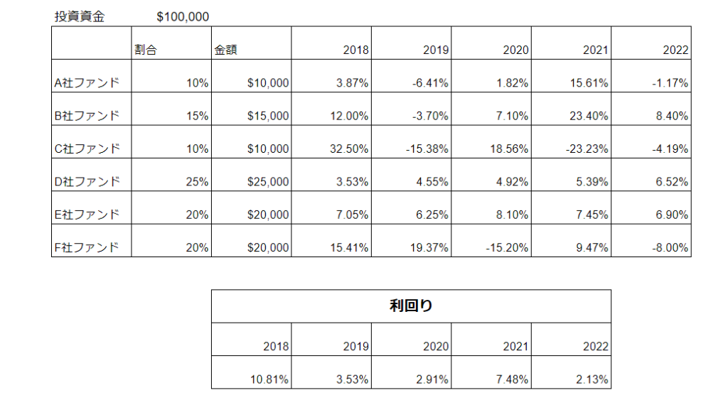 こちらは10万ドルの資金を、ポートフォリオを組んで投資した例となります。