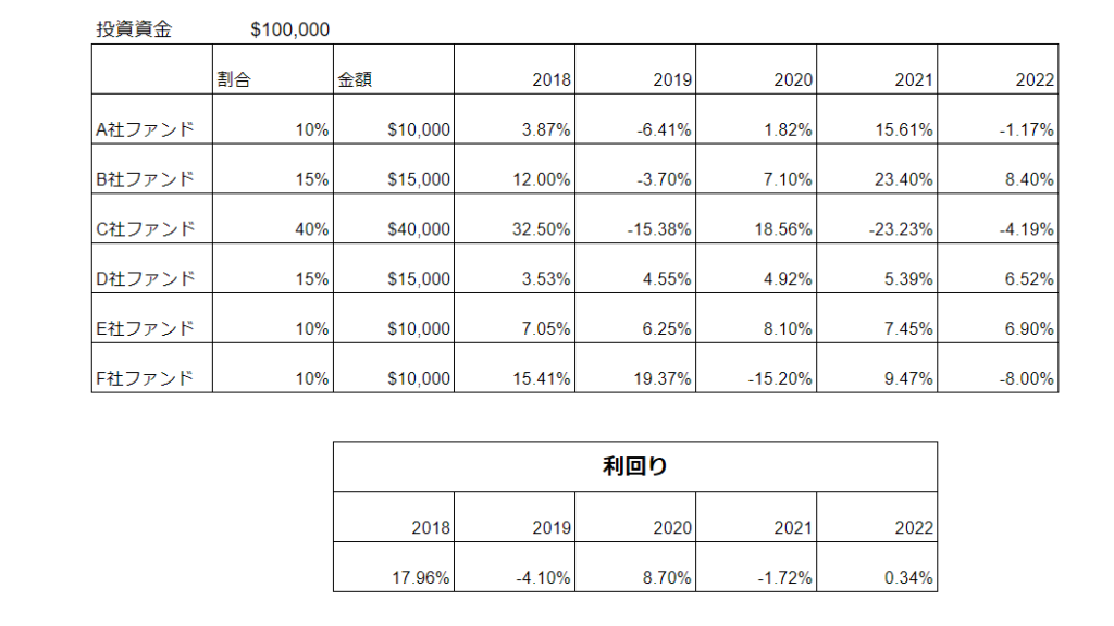 お分かりのように最初にはなかった、運用がマイナスになる年があります。しかし、もし1つだけのファンドに投資していた場合、どうなっていたでしょうか? C社ファンド、2018年はプラス32%以上のパフォーマンスですが、2019年はマイナス15%。2020年はプラス18%以上ですが、2021年はさらに大きなマイナスで、マイナス23%以上。大きくプラスとマイナスのパフォーマンスに振り回されることになってしまいます。しかし、他のファンドに投資をしていたことで、2019年、2021年のマイナスを低くすることができています。このようにポートフォリオを組むことで、損失を回避、低減することが可能なのです。