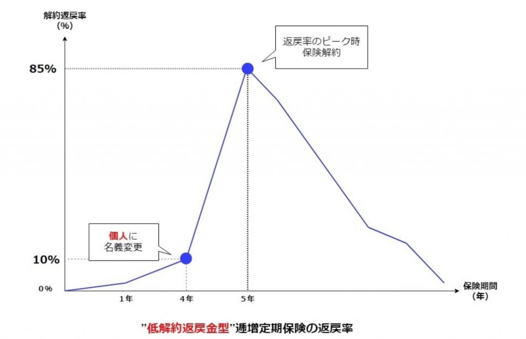 したがって、低解約返戻金期間の最後に会社から個人へ名義変更すると、その時の保険の評価額は大変低い額になりました。