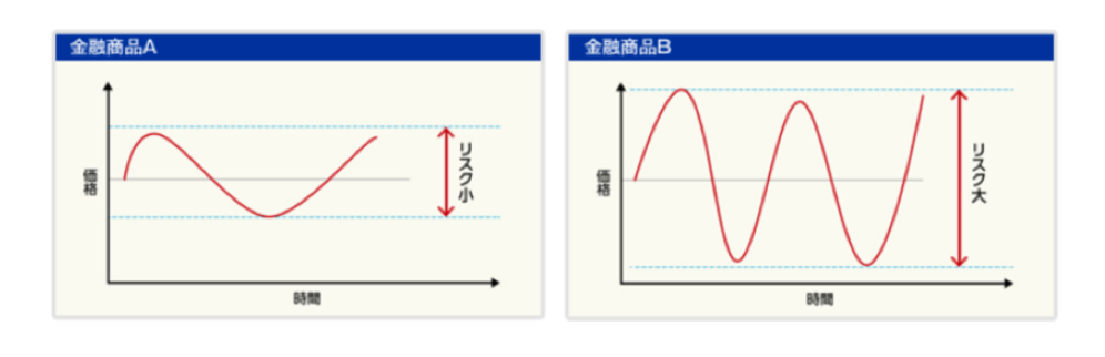 下のグラフは、リスクが小さい金融商品Aと、リスクが大きい金融商品Bをそれぞれ掲載しておりますが、「リスク」=「値動きのブレ幅」でしたから、値動きのブレ幅が大きいほどリスクが高いことを示しています。