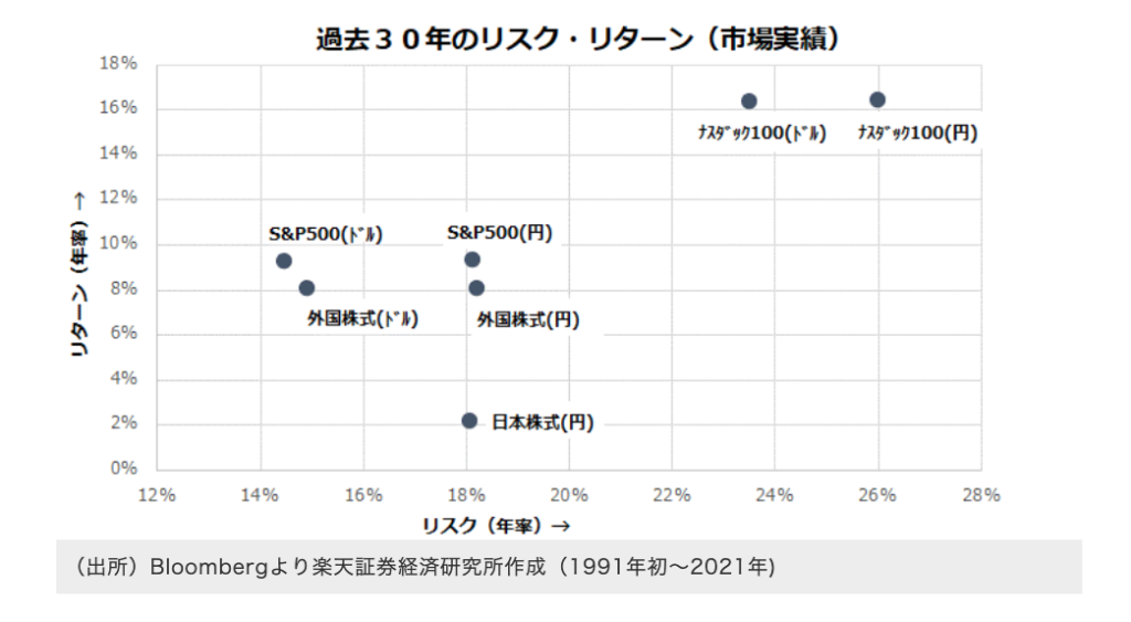 以下は、楽天証券経済研究所が作成した資料ですが、過去30年間のS&P500指数のリスク/リターンが掲載されていたのでお借りました。